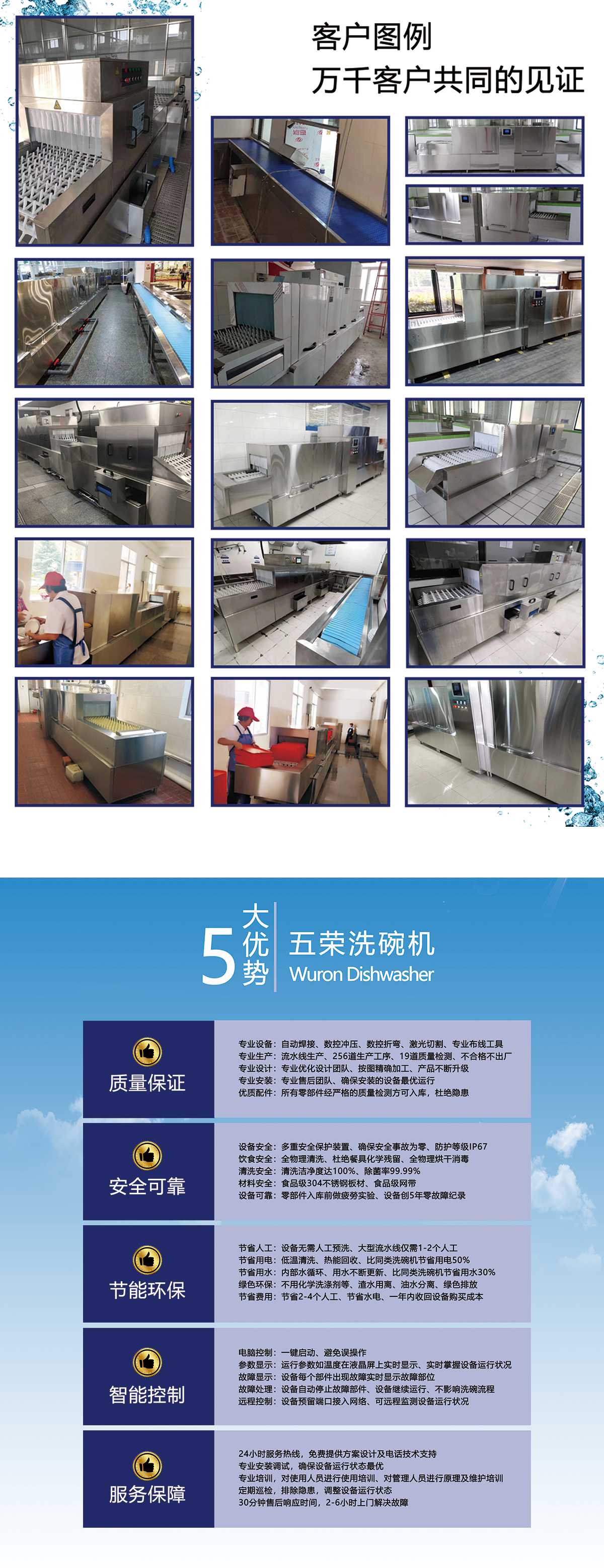 液晶显示机器运行数据,包括加热区域温度,时间和日期,机器故障信息,当电脑液晶屏提示故障情况时,系统自动关闭故障装置,设备照样工作,待餐具洗完后再行修理,真正实现了永不停机的功能。